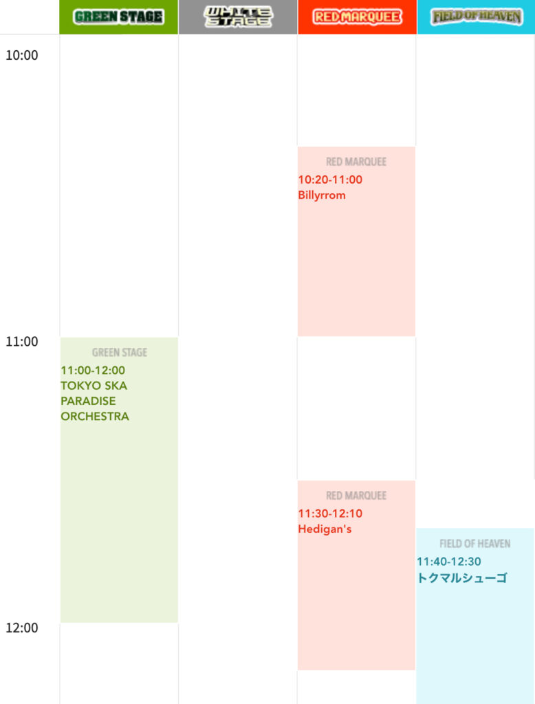 この時点でグリーンステージのスカパラがライブの最中で、レッドマーキーのHedigan’sがそろそろ始まる時間でした。